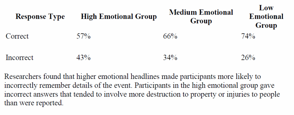 This study investigates whether the level of emotionally charged language in news headlines influences memory accuracy and belief in false information about real-world events.